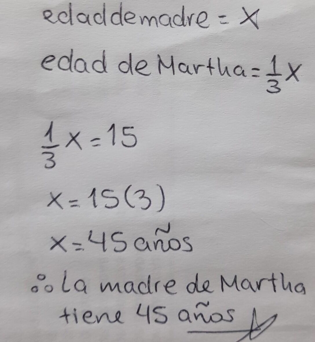 Ahora, para determinar la edad de la madre de Marta, sabemos que Marta tiene 15 años, que se define como la tercera parte de la edad de su madre. Siguiendo esta lógica, podemos calcular la edad de la madre dividiendo la edad de Marta entre 3 y multiplicándola por 4: