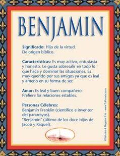 El nombre Benjamín proviene del hebreo y significa «hijo de la mano derecha» o «hijo de la felicidad». Su origen se remonta al nacimiento del último hijo de Jacob y Raquel, quienes lo llamaron así debido a la alegría que les trajo su llegada después de muchos años de espera.