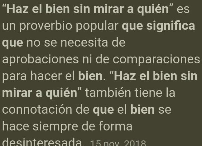 «Haz el bien sin mirar a quién» es un conocido refrán que nos invita a actuar de manera generosa y desinteresada, sin importar quién se beneficie de nuestras acciones. Esta expresión nos recuerda la importancia de ayudar a los demás sin juzgar ni discriminar, simplemente porque es lo correcto. Al practicar este principio, podemos contribuir a crear un mundo más solidario y equitativo. Gracias por tu consulta y hasta luego.